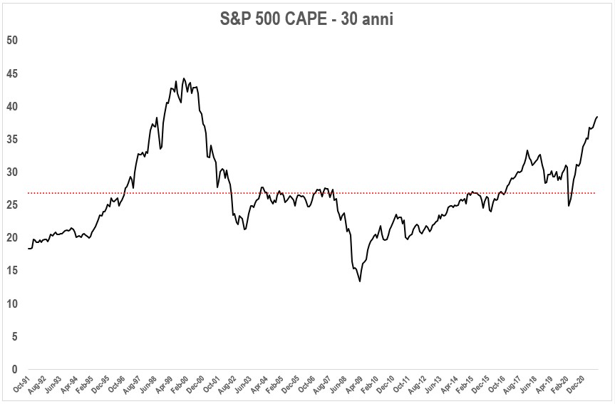 Inoltre, ha davvero senso continuare a paragonare i valori del CAPE con una media che prende in considerazione un periodo storico di oltre 100 anni? “Questa volta è diverso” è una frase pericolosa da pronunciare e da credere. Allo stesso tempo, risulta difficile ignorare che il CAPE si attesta al di sopra della media storica di lunghissimo periodo quasi ininterrottamente da 30 anni. E le ultime 3 decadi non sono state né monotone né monotematiche. Bensì, hanno visto l’alternarsi di momenti molto diversi tra loro: dalla caduta dell’LTCM nel 1998 allo scoppio della bolla dot-com del 2000; dal crollo epocale del 2008 al mercato toro più lungo di sempre dal 2009 al 2020. Possiamo permetterci di ignorare un lasso di tempo così lungo e fare finta che non ci sia davvero qualcosa di diverso nell’ecosistema? E l’immagine dipinta quando si tiene conto solo degli ultimi 30 anni è ben diversa: gli eccessi nelle valutazioni risultano, numericamente e a colpo d’occhio, molto meno accentuati.