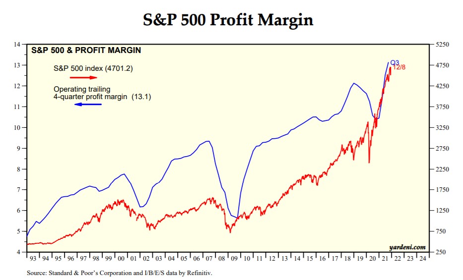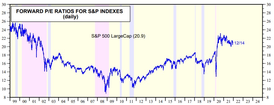 Una veloce occhiata al rapporto Prezzi/Utili Forward (cioè con gli utili attesi nei prossimi 12 mesi) mostra come nel 2021, nonostante gli importanti guadagni, si è osservata una contrazione dei multipli. Questo vuol dire che la ripresa dei corsi azionari dai minimi di Marzo 2020 è dovuta soprattutto a un rimbalzo dei profitti. Gli utili, infatti, son cresciuti ancor più velocemente dei prezzi. E le aspettative per il prossimo anno restano ottime, nonostante il muro di negatività.