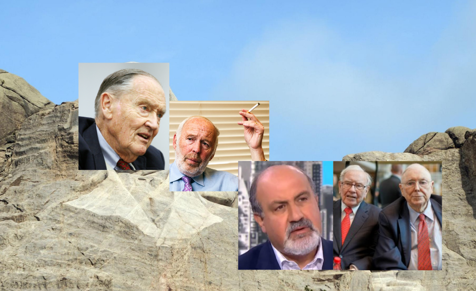 A titolo personale, lo colloco assieme all'”Oracolo di Omaha” sul mio Monte Rushmore del mondo di finanza e investimenti. Gli altri (da sinistra nella foto): Jack Bogle, Jim Simons e Nassim Nicholas Taleb. Ognuno per ragioni diverse.