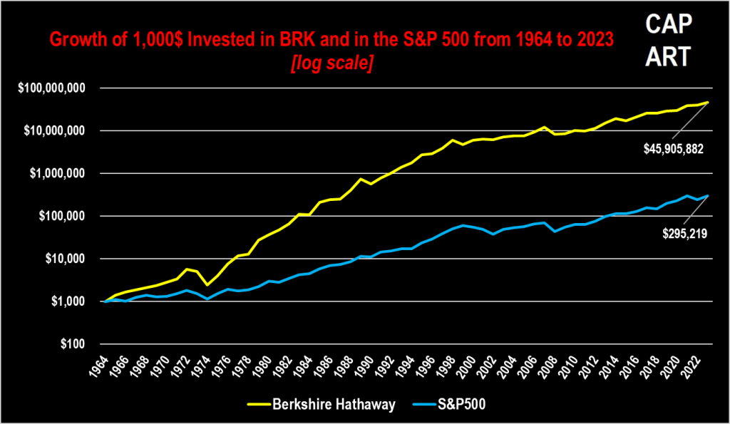 Durante questo percorso, l’S&P 500 ha reso poco più del 10% annualizzato. 1,000 dollari investiti a fine 1964, varrebbero oggi oltre 295,000. Per contro, Berkshire Hathaway ha reso quasi il 20% annualizzato, circa il doppio del principale indice americano. Eppure i 1,000 dollari iniziali si sarebbero trasformati oggi in quasi 46 milioni! 156 volte tanto! Discorso da prendere per quel che vale. Impossibile non tenere conto del fatto che quasi nessuno vive fino a 99 anni e/o investe per 60/70 di questi. Tuttavia, ben illustra, appunto, la forza dirompente e l’inarrestabilità del tasso di interesse composto.