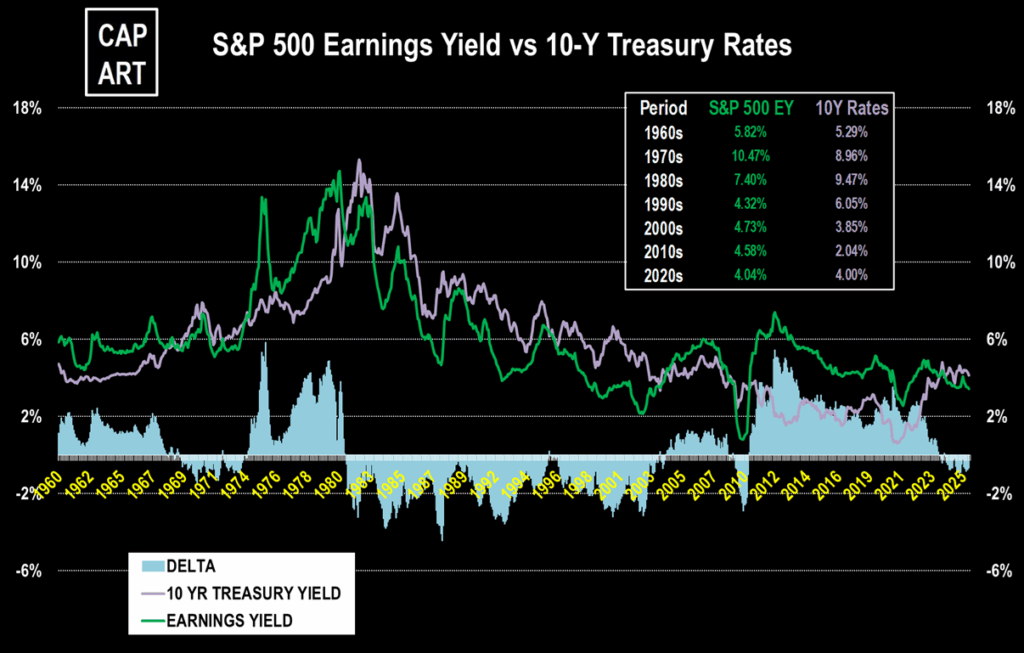 Qui entra in gioco la curva dei tassi obbligazionari, che diventa il principale punto di riferimento per il mercato azionario. Confrontando l’earnings yield dell’S&P 500 con il rendimento dei Treasury decennali USA, otteniamo una misura di convenienza relativa: quale delle due asset class offre oggi il miglior rendimento?