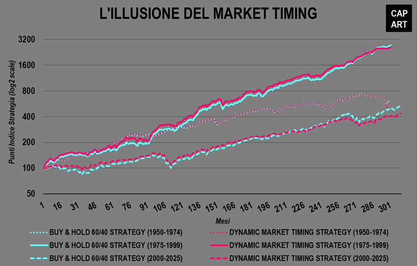 Certo, qui non parliamo di rischio di solvibilità, visto che non c’è leva in gioco. Ma il principio resta: tentare di anticipare il mercato, anche basandosi su dati fondamentali, modelli “razionali” o indicatori perfettamente coerenti, è un esercizio sterile. Porta solo a maggiore complessità operativa e, nella maggior parte dei casi, a una sottoperformance strutturale.