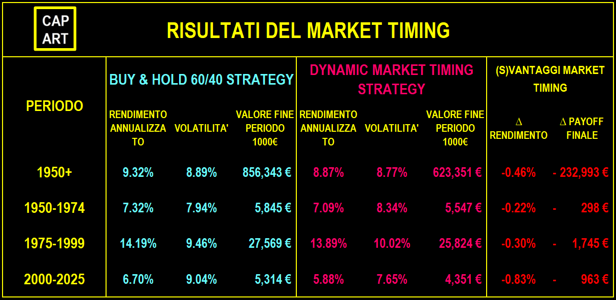 Risultato? Su tutti e tre gli orizzonti temporali analizzati, la strategia buy & hold con ribilanciamento automatico ha sovraperformato quella basata sul market timing. Senza nemmeno considerare lo svantaggio fiscale che fare continue e cospicue azioni di aggiustamento comporta.
