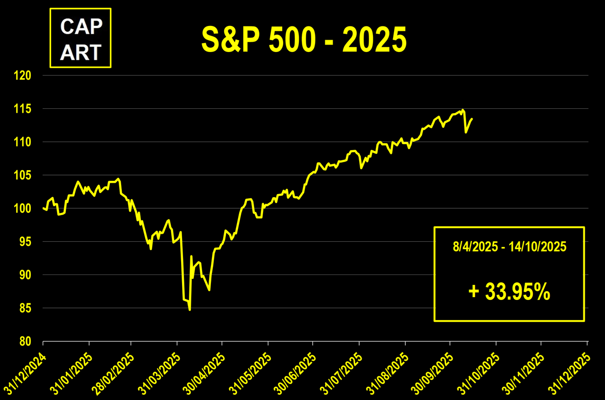 Più nel dettaglio, dai minimi registrati attorno al Liberation Day, tra l’8 aprile e il 14 ottobre, il mercato ha messo a segno un rally del +33,95%. È vero che questa corsa è arrivata dopo un brusco calo, alimentato da timori poi in gran parte rientrati: ripresa dell’inflazione, rischio di recessione globale, crollo dei consumi. Tutti fattori che, alla prova dei fatti, si sono rivelati meno gravi del previsto o semplicemente non si sono materializzati. Resta il fatto che, per quanto giustificata da un veloce “ritorno alla normalità”, la ripresa è stata significativa.